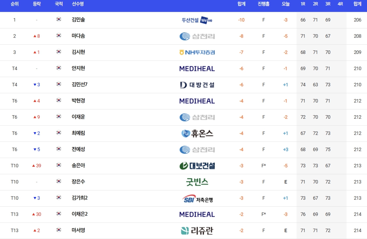 김민솔은 이날 버디 5개, 보기 2개로 3타를 줄여 합계 10언더파 206타를 쳐 5타를 줄이며 추격한 마다솜(삼천리)을 2타 차로 제치고 단독 선두를 지켰다.
