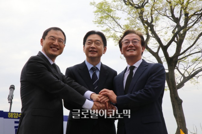 사진 왼쪽부터 김상욱 울산시장 후보, 김경수 경남지사 후보, 전재수 부산시장 후보.