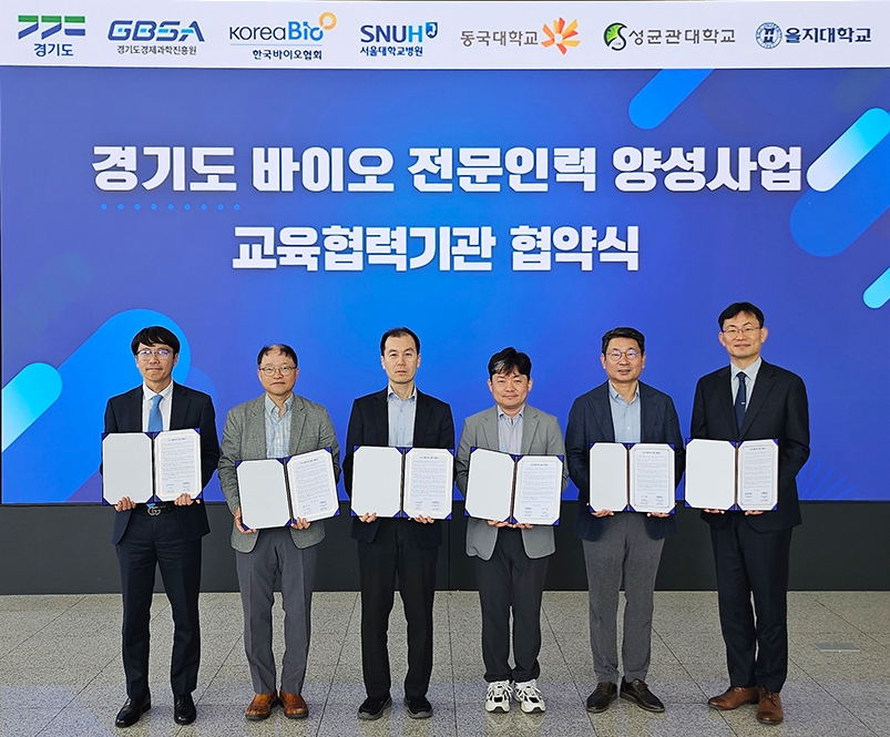 경기도와 경기도경제과학진흥원은 수원 광교 바이오센터에서 한국바이오협회, 분당서울대병원, 성균관대학교, 동국대학교(일산), 을지대학교(의정부)와 ‘2026년 경기도 바이오 전문인력 양성사업’ 추진을 위한 업무협약을 체결했다.