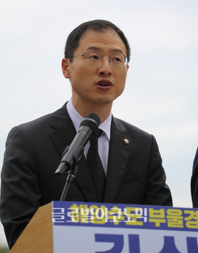 김상욱 민주당 울산시장 후보가 14일 오전 경남 김해 진영읍 봉하마을에서 열린 '해양수도 부울경 메가시티 공동출정식' 기자회견에서 발언 하고 있다. 사진=임승제 기자