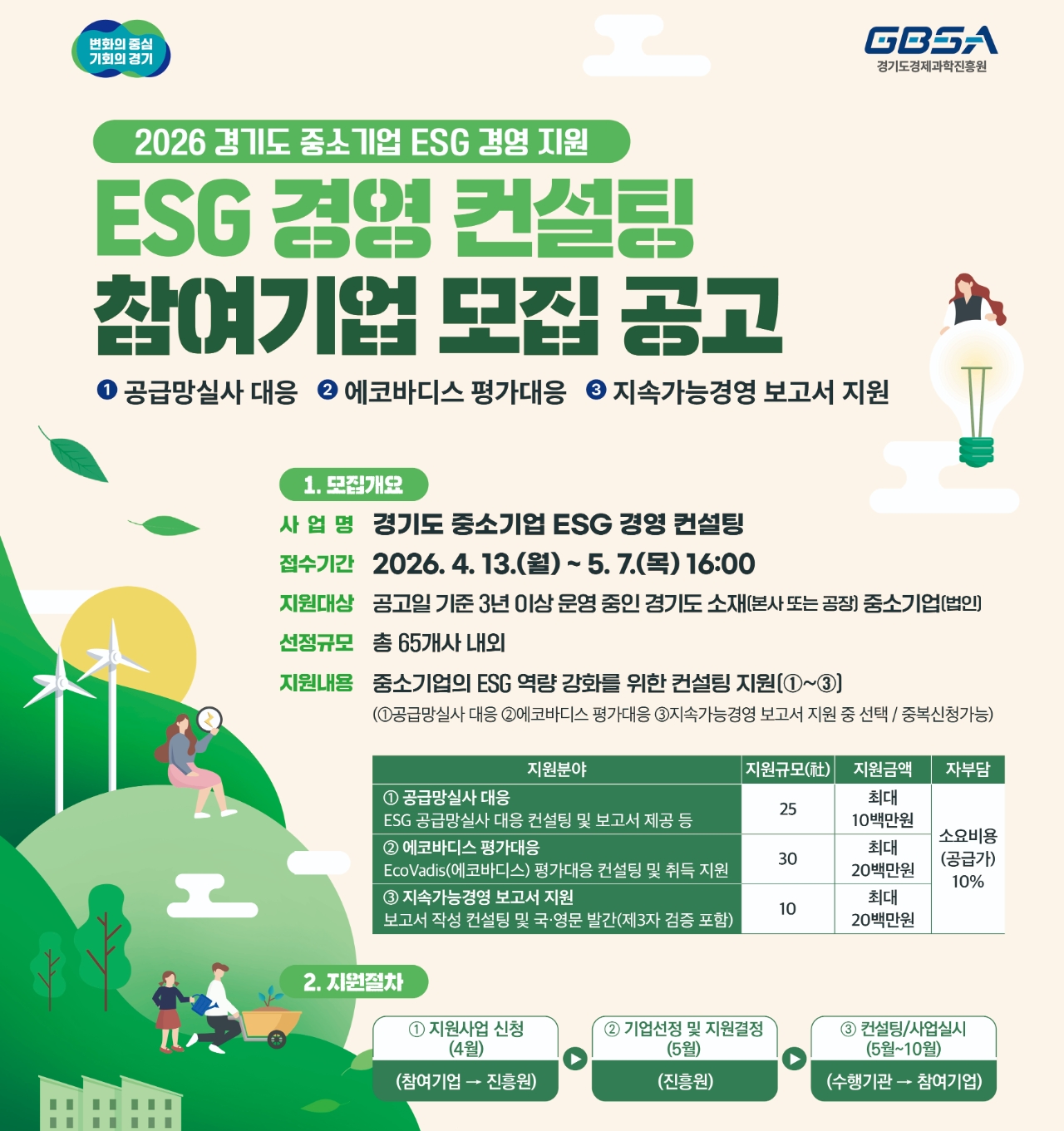 이미지 확대보기경과원은 ‘경기도 중소기업 ESG 경영 컨설팅 지원사업’ 참여 기업을 다음 달 7일까지 모집한다고 15일 밝혔다.