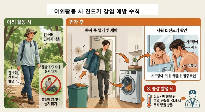 특히 진드기에 물린 뒤 고열, 근육통, 설사 등의 증상이 나타나면 즉시 의료기관을 방문하는 것이 중요하다.