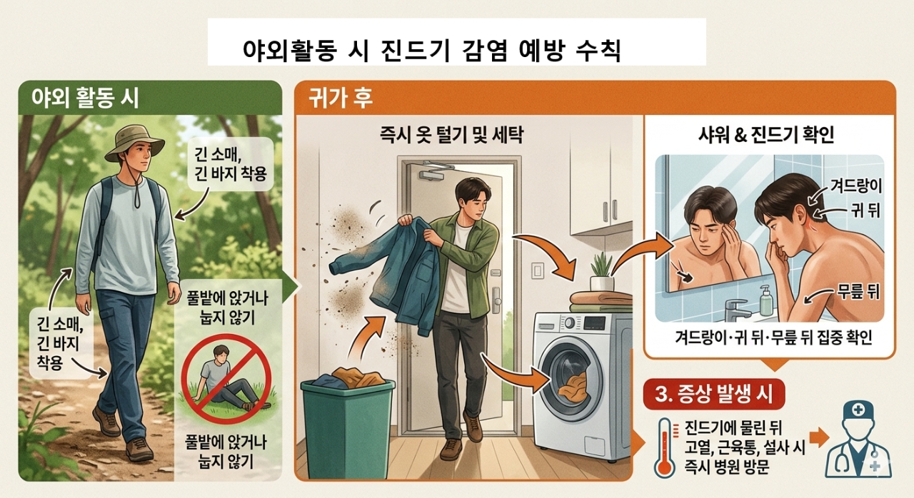 야외 활동 시에는 긴 소매와 긴 바지를 착용해 피부 노출을 최소화하고, 풀밭에 앉거나 눕는 행동을 피하는 것이 기본이다. 귀가 후에는 즉시 옷을 털고 세탁하며, 샤워를 하면서 겨드랑이·귀 뒤·무릎 뒤 등 진드기가 붙기 쉬운 부위를 집중적으로 확인해야 한다.