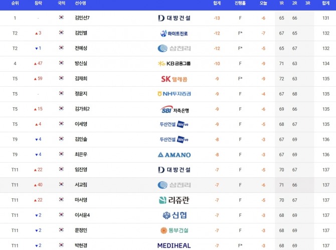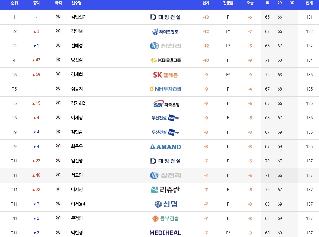 김민선7은 이날 보기 없이 버디만 6개 골라내 합계 13언더파 131타를 쳐 전예성과 김민별(하이트진로)을 1타 차로 따돌리고 단독 선두에 나섰다.