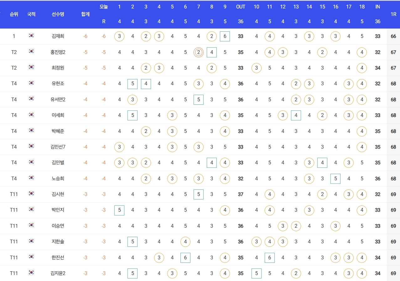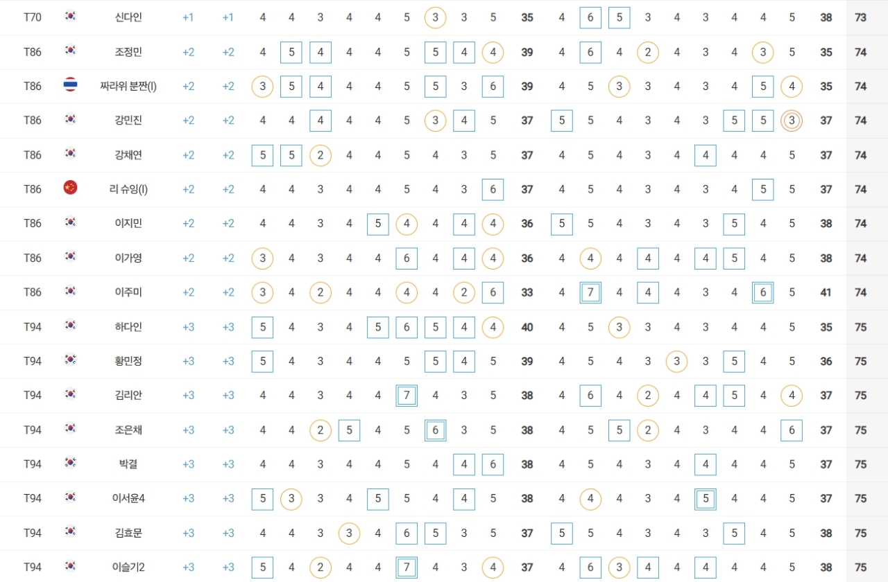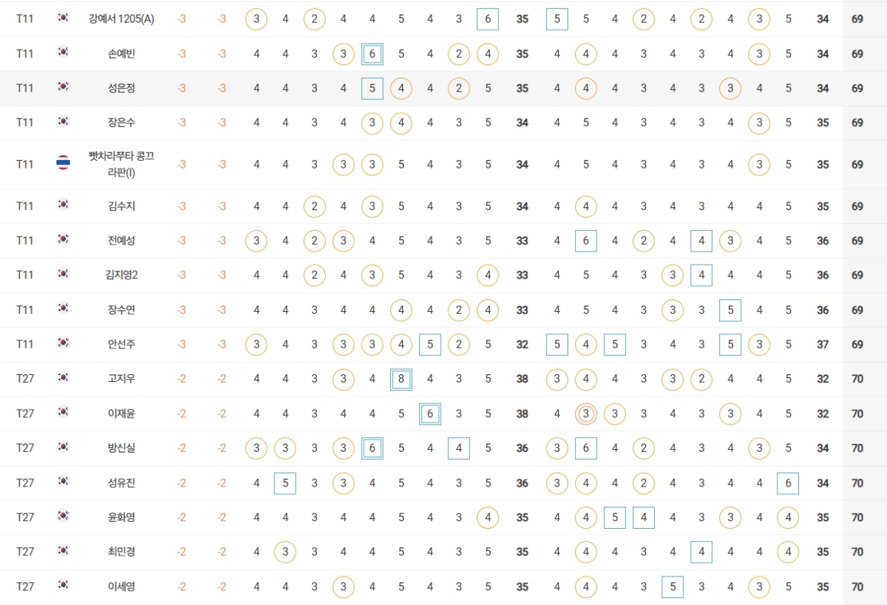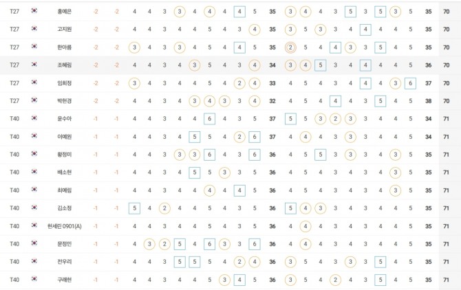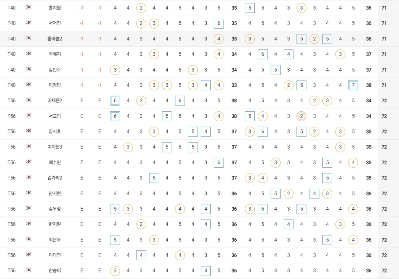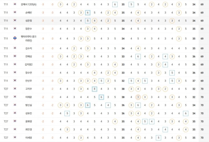 성유진(대방건설)은 2언더파 70타로 방신실(KB금융그룹), 박현경(메디힐), 한아름(DB손해보험), 최민경 등과 공동 27위, 이예원(메디힐)은 1언더파 71타로 문정민(동부건설), 최예림(휴온스) 등과 공동 40위에 랭크됐다.