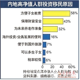 최근 중국의 자오상(招商)은행이 투자이민을 떠나는 중국인들을 대상으로 조사(복수 응답)한 바에 따르면 1위 자녀교육을 위해서(58%), 2위 재산을 지키기 위해서(43%), 3위 노후를 위해서(32%), 4위 해외투자 및 사업상의 편의를 위해서(16%), 5위 편하게 외국여행을 하기 위해서(7%), 6위 자녀를 더 낳을 수 있어서(6%), 세율이 낮아서(6%) 등으로 대답했다.