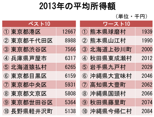 평균 소득이 가장 높았던 것은 도쿄도 미나토구(東京都港区). 2013년에는 2012년 대비 40.5% 증가한 1200만 엔대를 돌파하고, 7년 연속 톱을 유지했다.