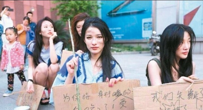 10여명의 차 모델들이 떨어진 옷을 입고, 하이힐을 신은 채 거지로 분장하여 상하이 번화가인 쉬자휘이(徐家匯)에서 구걸 시위를 벌였다.