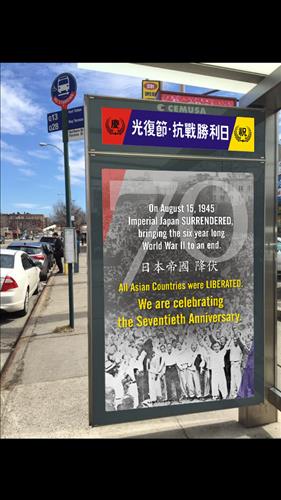 기업광고 전문 제작업체인 '브리지 엔터프라이지스'(Bridge Enterprises)의 한태격 대표는 13일(현지시간) '광복절·항전승리일'이라는 한자 제목의 광고판을 직접 만들어 뉴욕 플러싱의 2개 버스정류장에 설치할 것이라고 밝혔다.