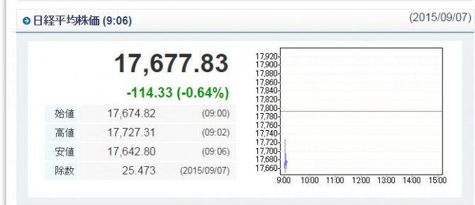 일본 증시가 미국 금리인상의 우려 속에 하락 출발했다. 그림은 9시6분 현재의 닛케이 주가.