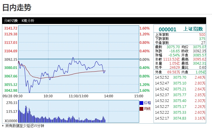 이미지 확대보기중국 상하이 종합지수는 추석이후 처음 열린 28일 중국증시에서 3085.57로 개장했다 하락세로 출발했다.