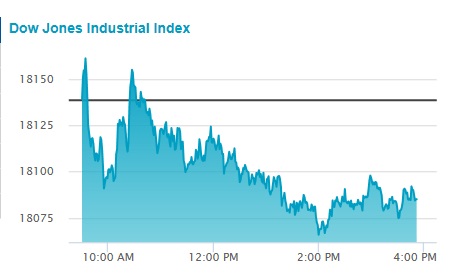 다우지수 DJIA는 1만8086.47으로 장을 마감했다. 전일대비 51.91포인트 비율로는 0.29% 하락한 것이다.