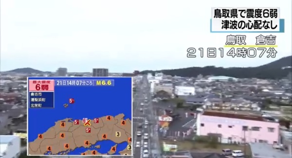 한편 일본 기상청은 이날 지진이 발생한 돗토리현 중부 지역의 경우 "작년 10월부터 사람이 감지할 수 있는 수준의 지진 발생 빈도가 잦아지고 있다"며 안전 주의를 요구했다.