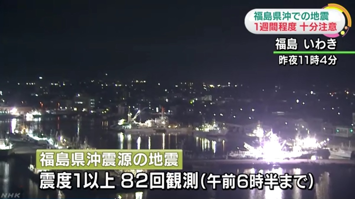 후쿠시마현에서는 22일 오후 11시께에도 진도 4의 흔들림이 관측되는 등 여진이 이어지고 있다. 기상청은 22~23일 오전 6시 반까지 진도 5에서 진도 1의 여진이 총 82회 관측됐다고 전했다.