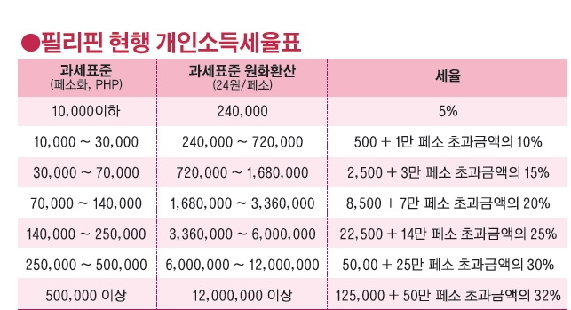 우리나라 개인소득세의 최고세율은 과세표준 3억원 이상에 대해 38%를 부과하고 있다. 필리핀의 개인소득세 최고세율은 과세표준 50만 페소(약 1200만원) 이상에 대해 32%를 부과하고 있다. 우리나라는 연 1200만원까지 6%의 최저세율 적용 대상이다. 우리 돈으로 월 100만원 이상의 소득(과세표준)이면 필리핀에서 최고세율을 적용받게 된다. 해외주재원으로서 필리핀 지사에 근무하게 되면 모든 주재원이 32% 최고세율을 부과 받게 된다는 의미다. 필리핀 개인소득세는 약 20년 전인 1997년에 만들어진 현실에 맞지 않는 세율체계다.