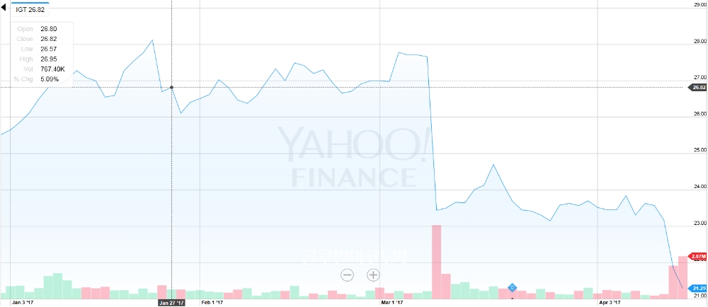 IGT 주가는 올해 들어 지속적으로 하락하고 있다. 이날 매각발표에도 주가는 2.52%(0.55달러) 떨어진 21.29달러에 마감했다.