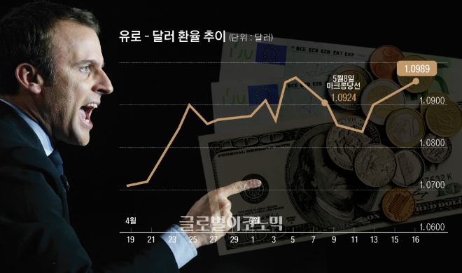지난 8일 프랑스 대선 결선 투표에서 마크롱 승리 소식이 전해지며 프랑스 정치 리스크에 대한 안도감이 확산되자 유로 환율은 한때 1.1023달러까지 치솟았다. 지난해 11월 도널드 트럼프 미국 대통령 당선 이래 최고치다. 하지만 이내 반락하며 1.08달러대에 거래됐고 15일 도쿄 외환시장에서 1.09달러대로 회복됐지만 여전히 맥을 못 추고 있다.