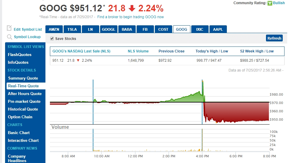 이 같은 실적 발표가 나온 후 구글의 주가는 시간 후 거래에서 폭락세를 보였다.