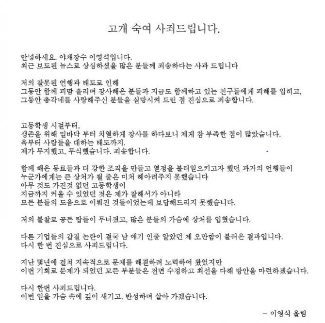 이영석 대표는 사태가 불거진후 "모두 반성하고 시정하겠다"는 사과문을 올렸다.
