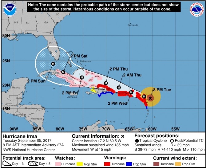 5일(현지시간) AFP통신은 카리브 해에 접근 중인 허리케인 어마가 최고 등급인 5등급으로 세력을 강화하며 플로리다 주를 향하고 있다고 보도했다.