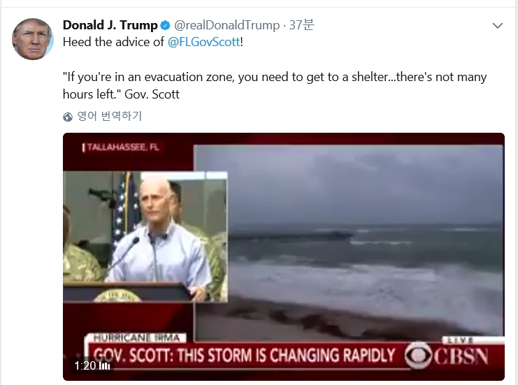트럼프 대통령은 트위터를 통해 시시각각 다가오는 위험에 대피할 것을 계속 알리고 있다.