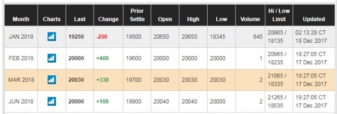 한편 비트코인은 18일 미국 최대선물거래소인 CME에 정식 선물종목으로 상장됐다. 이날 CME에서 비트코인 1개월짜리 선물의 가격은 2만650달러에 거래를 개시했으나 2시간여 만에 1만8500달러 선으로 떨어졌다. 지금 이 시각은 1만9200달러 선에서 거래되고 있다. 거래량은 미미한 수준이다.