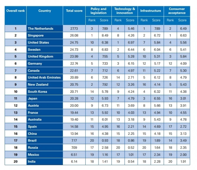 네덜란드는 4개 항목 중 소비자 수용성에서 압도적인 1위를 차지하면서 전체 순위에서도 1위에 올랐다. 싱가포르는 기반시설과 기술 및 혁신에서 1위를 차지했으나 전체 순위에서는 네덜란드에 조금 밀려 2위에 올랐다. 미국은 정책 및 제도에서 1위를 차지하면서 전체 순위 3위에 랭크됐다.