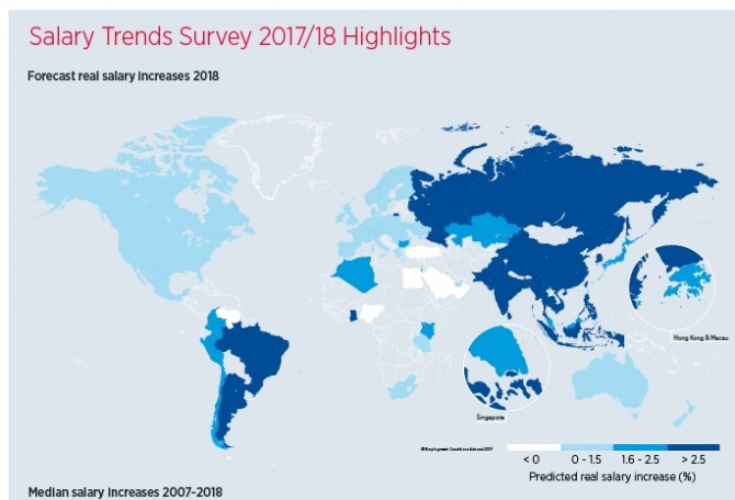 국별로는 아르헨티나 (Argentina) 봉급생활자들의 2018년 중 평균 임금 증가율이 25%에 이를 것으로 나타났다. 여기에 물가 상승률 전망치 17.8%를 차감하면 실질 가격 기준으로 7.2 % 오를 전망이다. 이 같은 상승률은 조사대상 71개국 가운데 가장 높은 것이다.