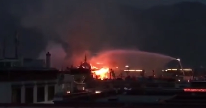 이미지 확대보기17일 세계문화유산에 등록되어 있는 티베트 라싸 조캉사원에 화재가 나 불길이 치솟고 있다. 자료=유튜브