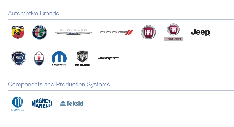 이미지 확대보기모기업인 피아트 크라이슬러 오토모빌스 N. V. 산하에 피아트의 후신인 FCA Italy와 크라이슬러의 후신인 FCA US를 두고 있다. 피아트 크라이슬러 오토모빌스 N. V. 의 브랜드로는 알파 로메오, 크라이슬러, 닷지, 피아트, Fiat Professional, 지프, 란치와, Ram Trucks, Abarth, Mopar등이 있다. FCA Italy와 FCA US이외에도 마세라티, Comau, Magneti Marelli, Teksid등도 거느리고 있다.