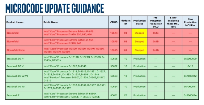 패치가 중단된 CPU는 'Penryn', 'Yorkfield', 'Wolfdale', 'Bloomfield', 'Clarksfield', 'Gulftown', 'Jasper Forest(Nehalem)', 'Harpertown', 'SoFIA 3GR'이 포함됐으며, '코어 2 Duo E8400' 등 왕년의 히트 CPU뿐만 아니라, 2015년으로 비교적 최근에 출시된 'Atom x3 C3000' 시리즈 등도 지원 대상에서 제외됐다.