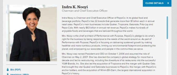 펩시 주주들의 간곡한 개편 의지에 감복하여 GE카드를 버리고 펩시 쪽을 선택했다. 인드라 누이가 당대 최고의 기업인 GE행을 거절한 것은 지금까지도 화제다.