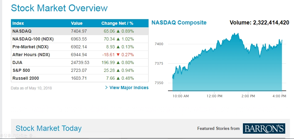 미국증시 최종마감 현지시간 Data as of May 10, 2018