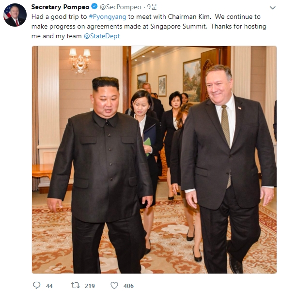 이미지 확대보기7일(한국시간) 마이크 폼페이오 미국 국무장관은 자신의 트위터에 "김정은 위원장을 만나기 위해 평양으로 즐거운 여행을 다녀왔다"며 글을 남겼다.