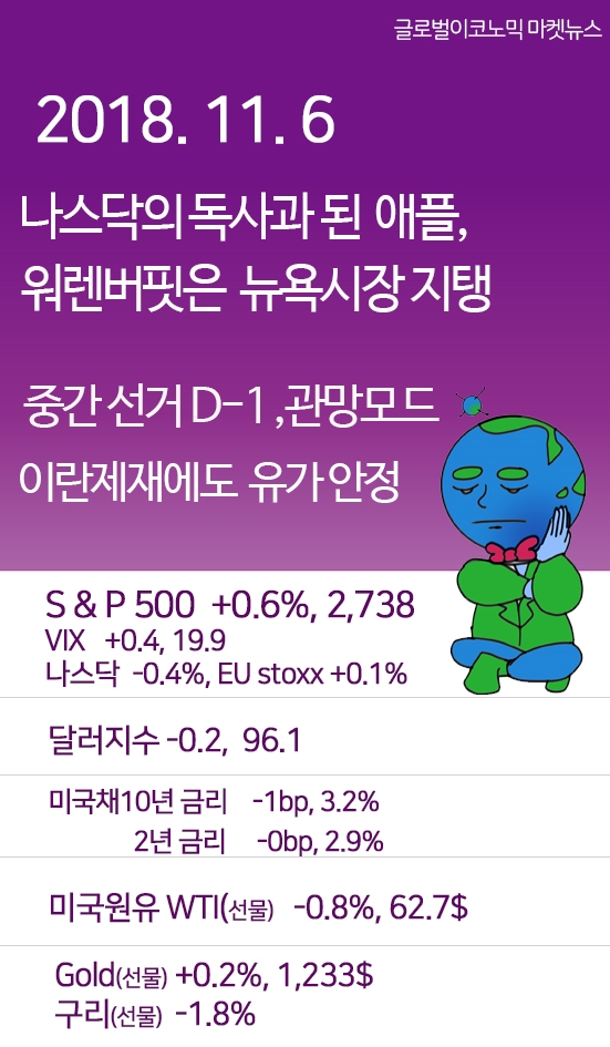 [글로벌 마켓뉴스] 11/6 나스닥의 독 사과가된 애플, 워렌버핏이 지킨 뉴욕시장... 중간선거 관망분위기