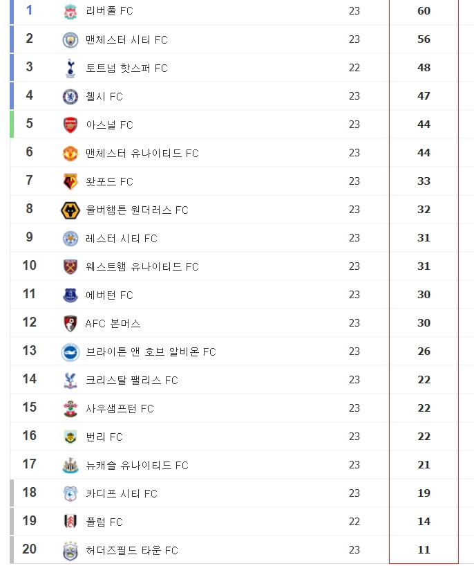 이에따라 프리미어리그 EPL 순위는 ①리버풀 ②맨체스터 ③ 토트넘 ④첼시 ⑤ 아스널이 됐다.