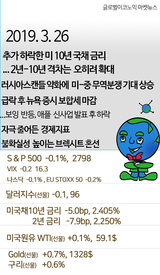 *주요가격: 다우 +0.1%/ S&P500 -0.1% / 나스닥 -0.1% / 러셀2000 +0.0%, / VIX -1%, 16.3 / EU STOXX50 -0.2% / 달러지수(선물) -0.1%/ 미국채 10년 -5bp, 2.405% , 장단기 금리차 15.5bp / 국제유가 WTI +0.1%/ 금 +0.7%, 구리 +0