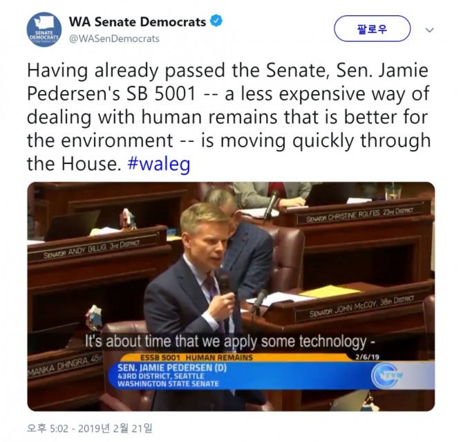 이미지 확대보기'사체 퇴비화' 신법을 발의한 주의회 제이미 피더슨(Jamie Pedersen) 상원 의원은 "인간은 자신이 선호하는 방법으로 자신의 시신을 처리하는 결정을 내릴 자유가 있어야 한다"며 "신법은 인간의 사체를 흙으로 빨리 변화시키는 방법"이라고 표현했다.