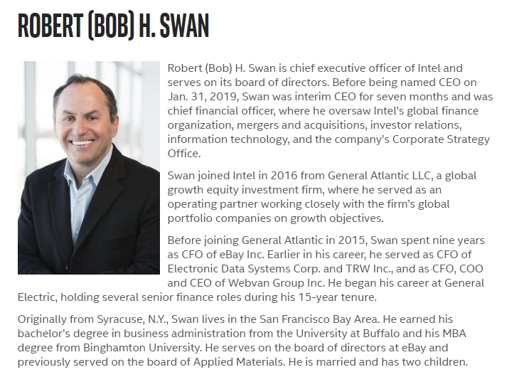 로버트 스완 CEO는 인텔에 합류하기 전에는 제너럴 아틀란틱 LLC(General Atlantic LLC)의 운영 파트너였다.