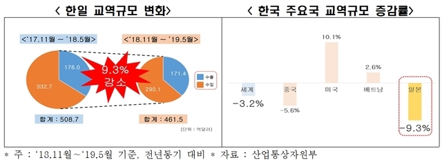 또 작년 11월부터 올해 5월까지 양국 교역 규모가 전체적으로 9.3% 줄어든 가운데, 양국 간 밸류체인의 가교역할을 수행하는 중간재 교역 규모도 8.3% 감소한 것으로 나타났다.