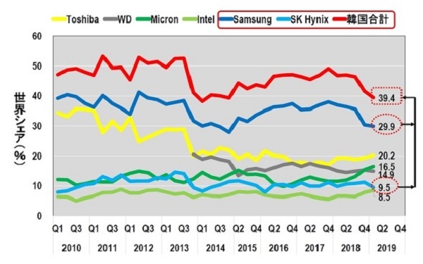 삼성전자의 낸드 플래시는 매출액 점유율은 39.4%로 전체 1위이며 5위인 SK하이닉스는 9.5%를 차지한다. 양사 합쳐서 39.4%로 D램보다는 점유율이 훨씬 낮다. 하지만 낸드 플래시를 내장한 솔리드스테이트드라이브(SSD)의 기업별 분기 출하대수는 1위 삼성전자가 33.4%, 3위인 SK하이닉스는 9.9%의 점유율을 차지하고 있다.