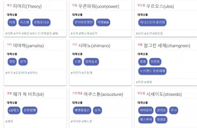 일본산 제품의 리스트와 그 대체재를 알려주는 사이트이다.