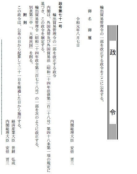 일본 경제산업성은 7일 한국을 수출관리 상의 일반 포괄허가 대상인 이른바 '백색국가' 즉 화이트리스트에서 제외하는 것 등을 내용으로 하는 수출무역관리령 개정안을 공포하면서 8월 28일부터 시행한다고 밝혔다.
