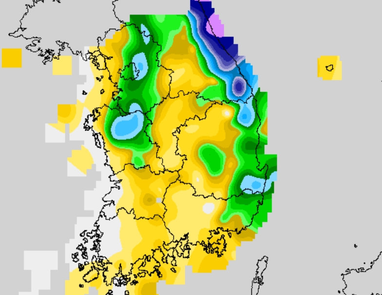 - 강원영동, 울릉도.독도, 북한: 50~100mm(많은 곳 강원영동 150mm 이상)