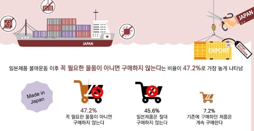 47.2%는 '꼭 필요한 물품이 아니면 일본제품을 구매하지 않는다'고 했고, '일본제품은 절대 구매하지 않는다'는 응답도 45.6%에 달했다.