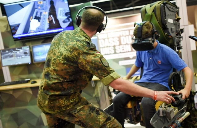 게임즈컴 컨벤션에서 독일연방군 부스에는 수십 명의 젊은 게이머들이 군대 비행시뮬레이터에서 손을 대거나 2인 게임에서 반응을 테스트하기 위해 몰려 들었다. 군 요원들은 군대 계급 생활의 현실과 폭력적인 군사 기반 비디오 게임의 차이를 정확히 설명하며 보병에 열중했다.