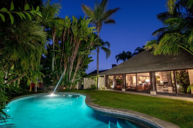 1.44에이커(약 1763평) 대지에 단층으로 지은 이 저택은 넓이 4770평방피트(약 134평)로 침실 4개와 욕실 5개로 구성되어 있다. 방문객들은 백합 연못과 이어지는 이중문을 통해 오픈 형 거실과 주방으로 들어간다. 천장을 따라 노출된 목재 빔과 섬세한 나무 기둥들이 거실을 장식한다. 바닥에서 천장까지 이어진 대형 창문을 통해 푸른 잔디밭과, 수영장 너머의 LA 도시 전경을 한눈에 볼 수 있다.