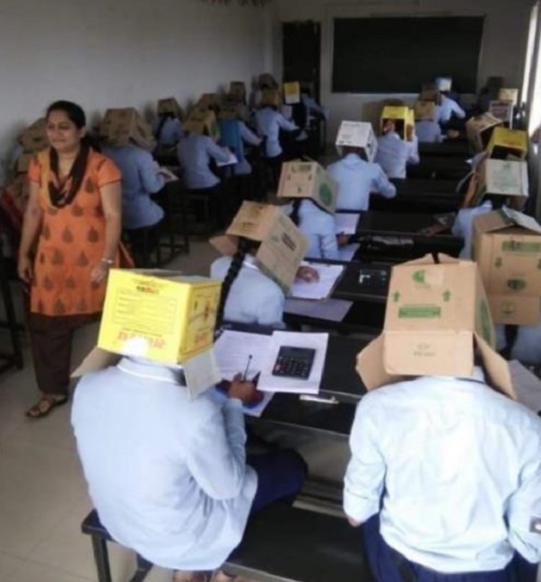 20일 연합뉴스의 인도 매체 인용 보도에 따르면, 타임스오브인디아 등 인도 언론들은 지난 16일(현지시간) 카르나타카주 하베리의 한 대학교 화학시험에서 학생들의 커닝 방지를 위해 각자의 머리에 상자를 쓰고 시험을 보도록 했다고 전했다.