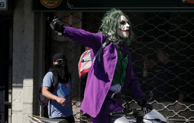 이 영화를 본 일부 홍콩 시위참가자는 정의의 아군 배트맨이 아닌 악역 조커에게 ‘레지스탕스(저항)의 상징’ ‘반역자의 정신적 리더’로서의 ‘히어로’를 보고 있다고 말하기도 한다. 영화에서 조커를 연기한 것은 호아킨 피닉스로 어설픈 길거리 광대였던 아서 플렉이 고담시티 유수의 흉악한 범죄자 ‘조커’로 변모해 가는 역할이다. 빈부격차가 커지고 황폐해진 고담시티에서 권력을 비웃는 ‘조커’에게 자신들의 모습을 덧씌우고 있는 것이다.