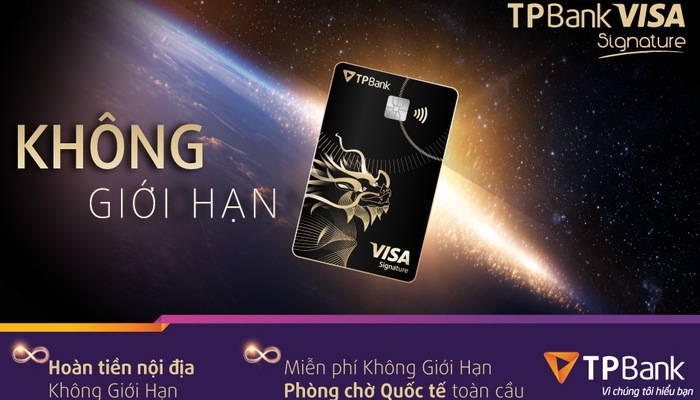 TP뱅크 비자 시그니처는 한도제한이 없으며 카드 소지자는 각 국내 지출 거래액의 0.5%를 환급받는다. 특히 외화 환산 수수료가 0.95%에 불과하다. 예약없이 베트남 국내선 라운지를 제외한 전 세계 공항의 1100개 이상의 VIP 라운지를 무제한으로 이용가능하다. 전 세계 190만 개 이상의 ATM기기와 1000만 개 이상의 매장에서 사용할 수 있다. 해외여행시에도 100억 동(약 5억 원) 규모의 글로벌 여행 보험 패키지를 제공한다.